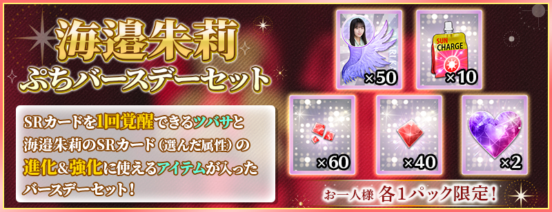 「ぷちバースデーセット」は、海邉朱莉のSRカードを1回覚醒できる分の覚醒アイテムと、海邉朱莉のSRカードを進化&レベルMAXまで強化できる分の育成アイテムがセットになったお得なセットです!