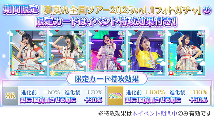 期間限定ガチャ「真夏の全国ツアー2025フォトガチャ vol.1」から出現する『限定フォトカード』は、10/24(金)から開催するイベントで特攻効果を発揮します!