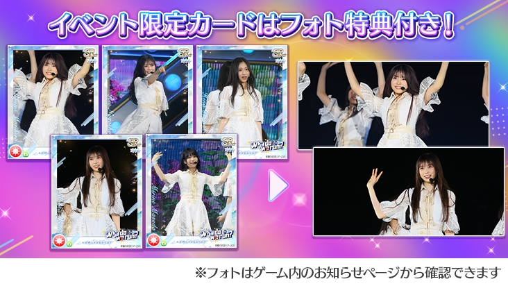 ※配信された際、ユーザー様のイベント中におけるイベント楽曲のプレイ情報(スコアやコンボ、LIVE鑑賞モードの解放など)はリセットされます。予めご了承ください。