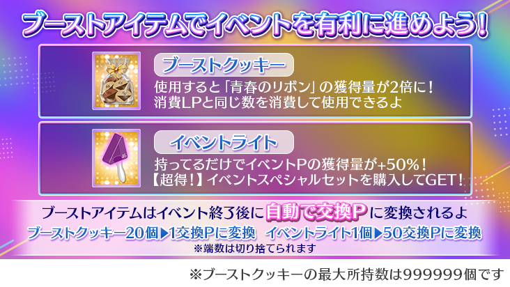 ※「青春のリボン」の所持上限数は「99999」です。それ以上の所持はできませんのでご注意ください。