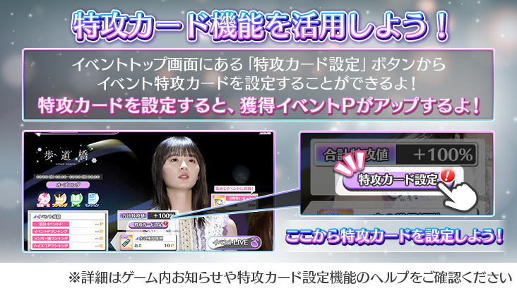 特攻効果付きカードは、イベントTOP画面にある「特攻カード設定」にカードを設定することで特攻効果を発動します!