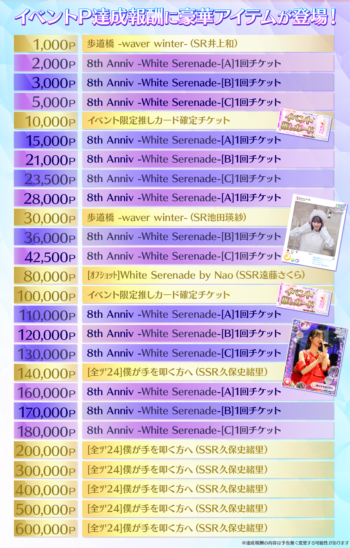 メンバー別ランキング報酬には、乃木フェス8周年を記念した「8周年メモリアルスノーパネル」が登場します!